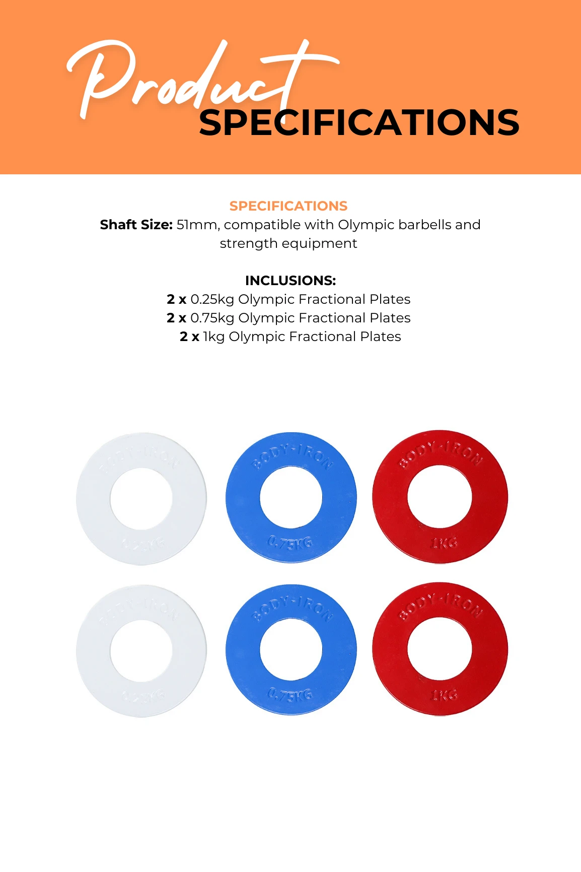 This Body Iron weight plate pack comes with three pairs of fractional plates, ranging from 0.25kg – 1kg.