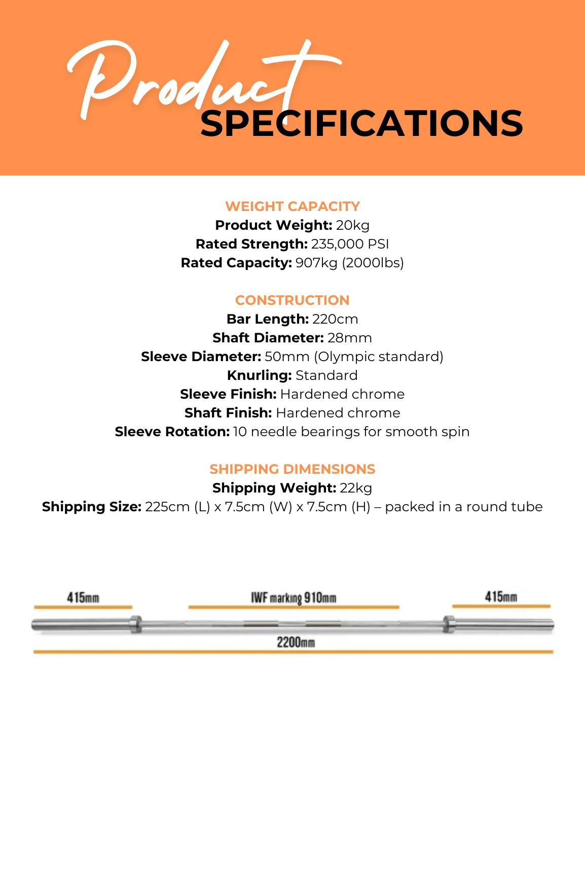 - Tensile Strength: with a 235,000-psi rating, this barbell is virtually unbendable. This makes it the ideal choice for Olympic lifting.