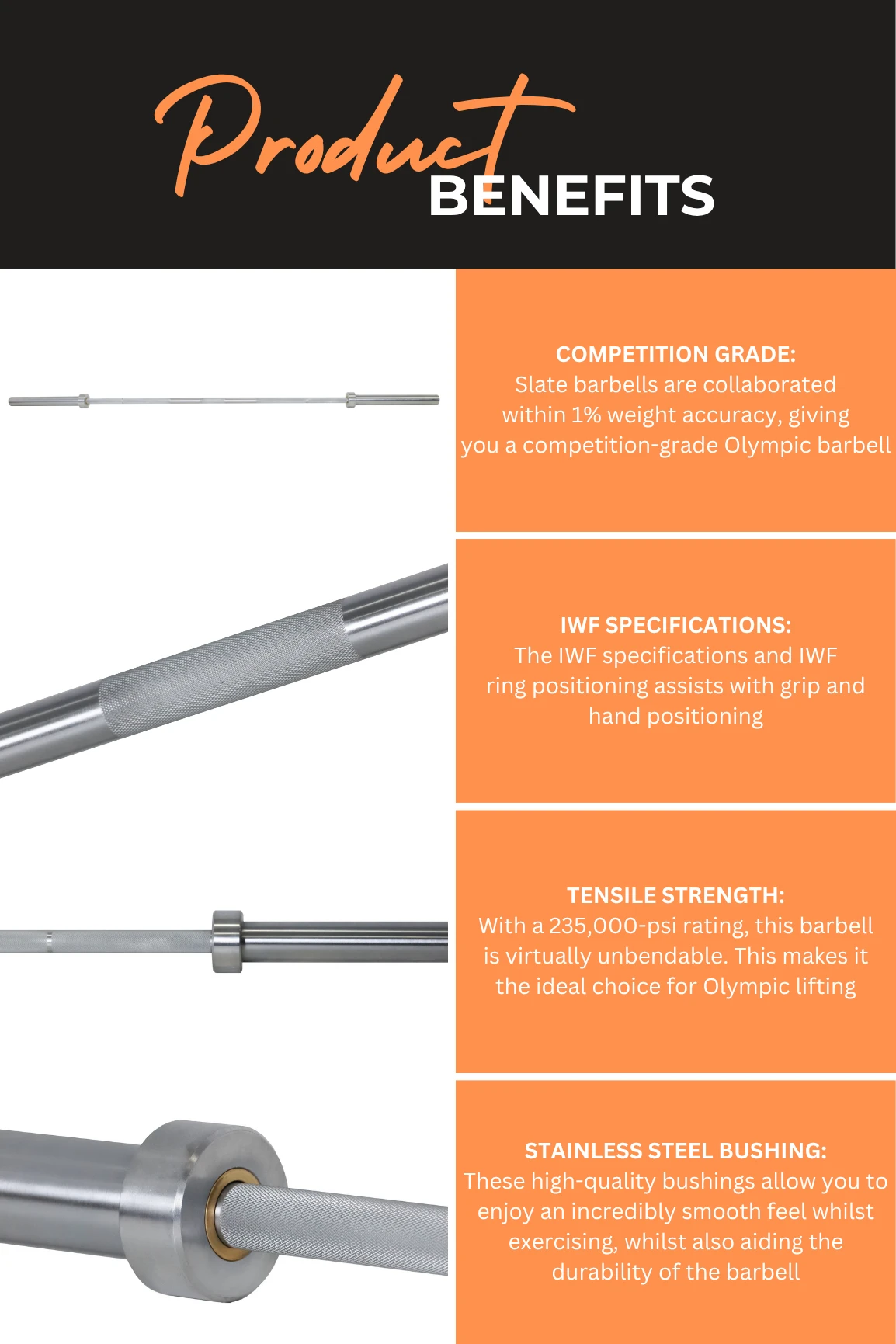- Competition Grade: Slate barbells are collaborated within 1% weight accuracy, giving you a competition-grade Olympic barbell.
