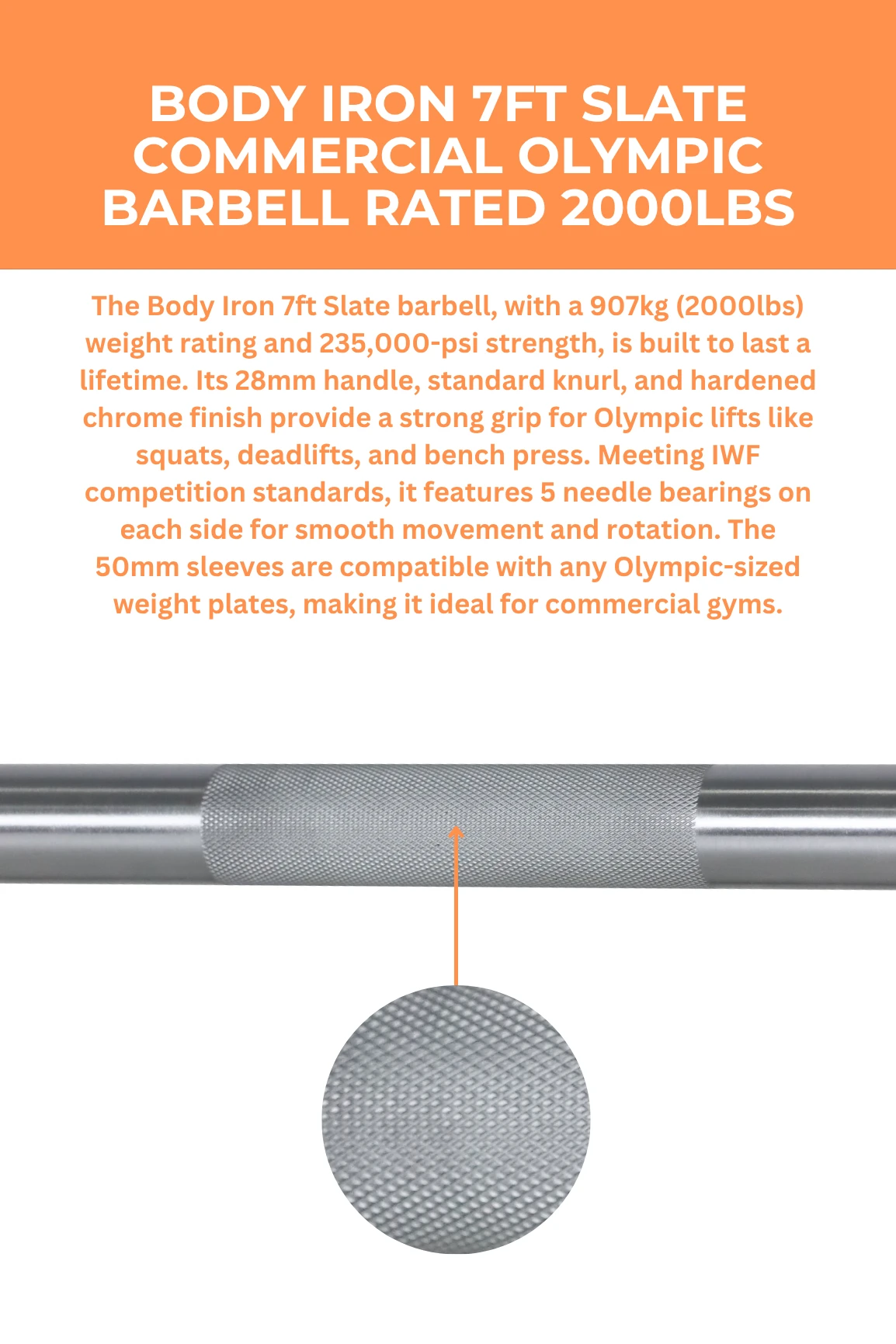 The Body Iron 7ft Slate barbell will take your strength training to the next level! With a massive weight rating of 907kg (2000lbs), this bar well exceeds the capabilities of human strength. Pair this with a 235,000-psi rating and this bar is going to last you a lifetime!