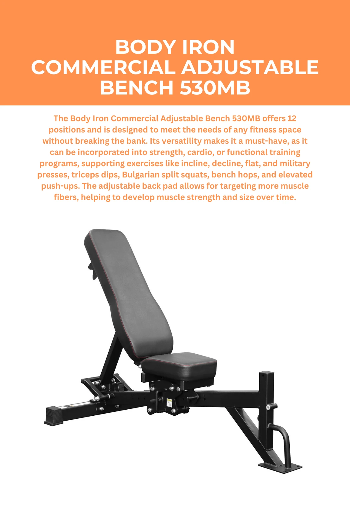 Due to its versatility alone this is a must have piece of fitness equipment. The Body Iron Commercial Adjustable Bench 530MB can be incorporated into any strength, cardio or functional training program, and can be used to perform an abundance of exercises such as; incline, decline, flat and military presses, triceps dips, Bulgarian split squats, bench hops and elevated push ups.