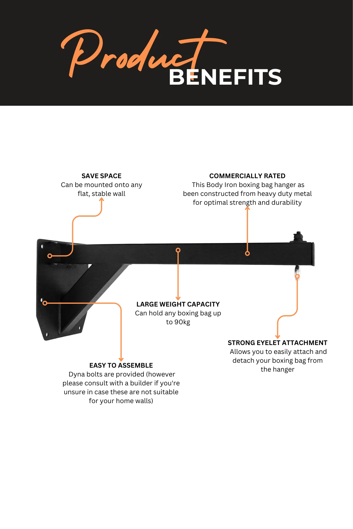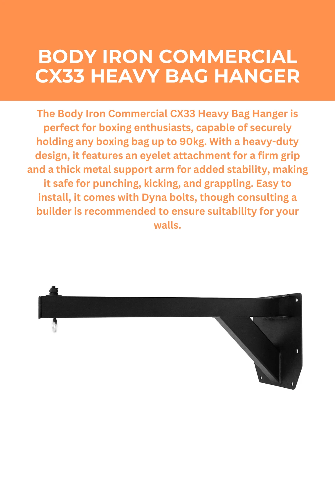 The Body Iron Commercial CX33 Heavy Bag Hanger is super easy to install, with Dyna bolts provided with every purchase. Please note, we do recommend consulting a builder if you’re unsure whether these bolts are suitable for your walls.