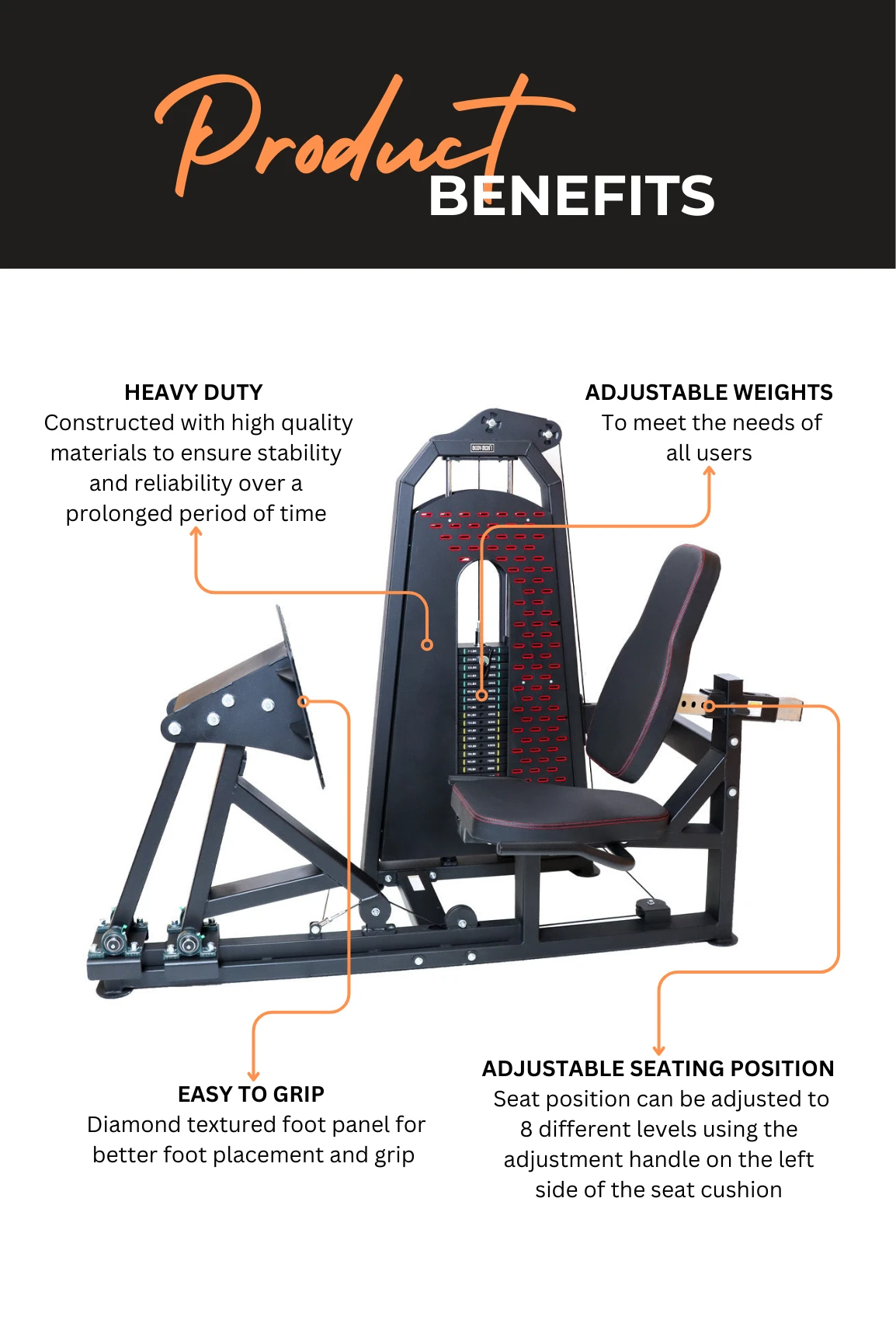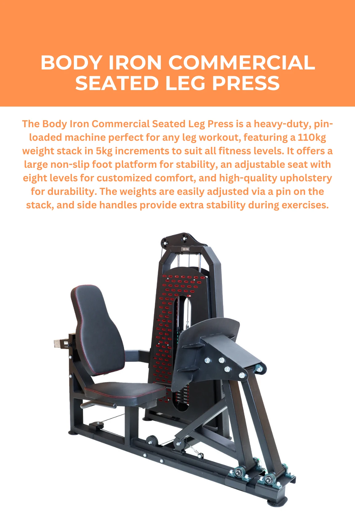 The Body Iron Commercial Seated Leg Press is our heavy duty pin-loaded leg machine that is a must have for your next leg workout. With a whopping 110kg weight stack, divided into 5kg increments, this will be sure to cater to users of all fitness levels.