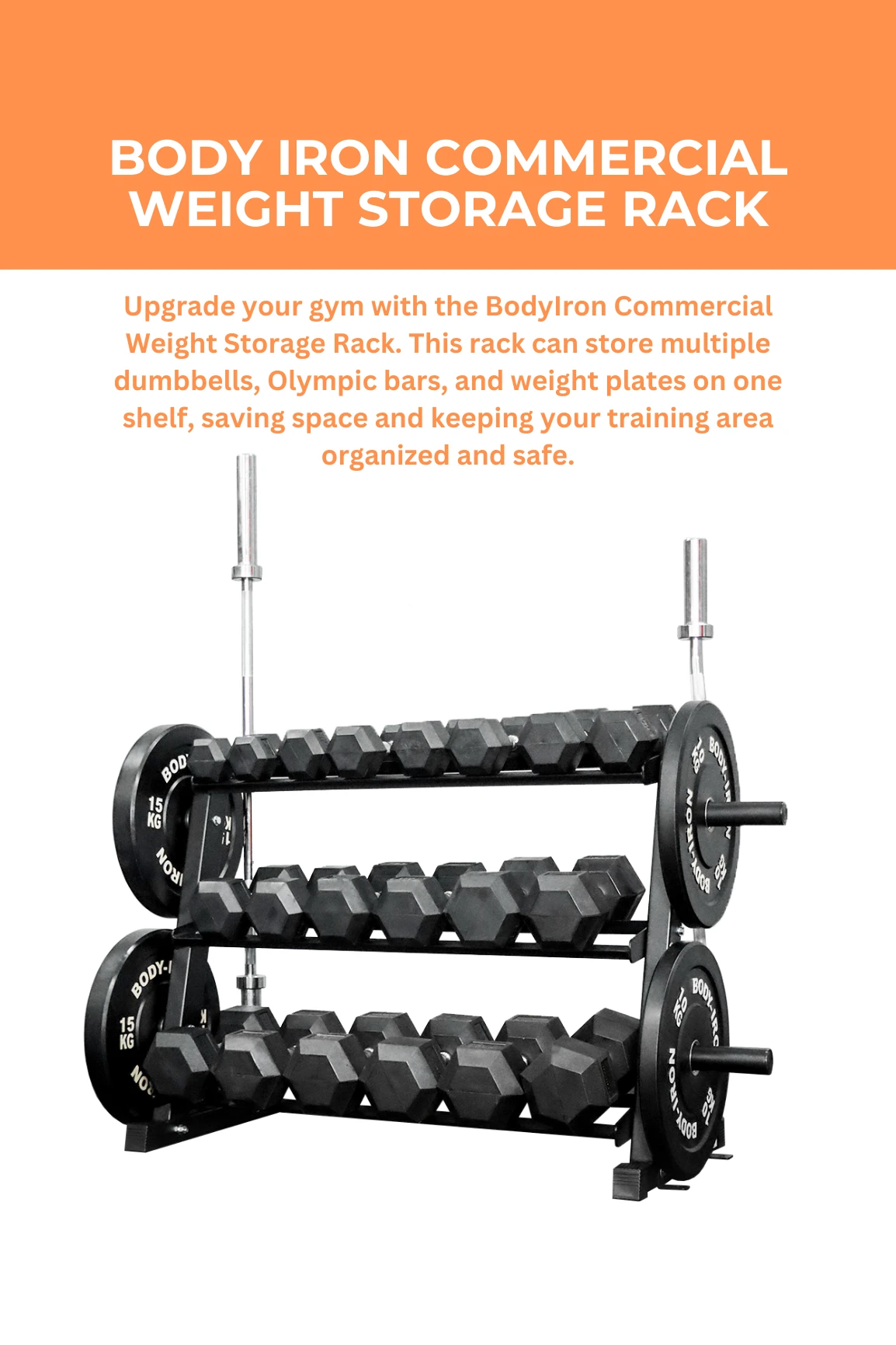 Upgrade your gym with the BodyIron Commercial Weight Storage Rack. This rack can store multiple dumbbells, Olympic bars, and weight plates on one shelf, saving space and keeping your training area organized and safe. Its sturdy construction maximizes your storage capacity, making it the perfect addition to your workout setup.