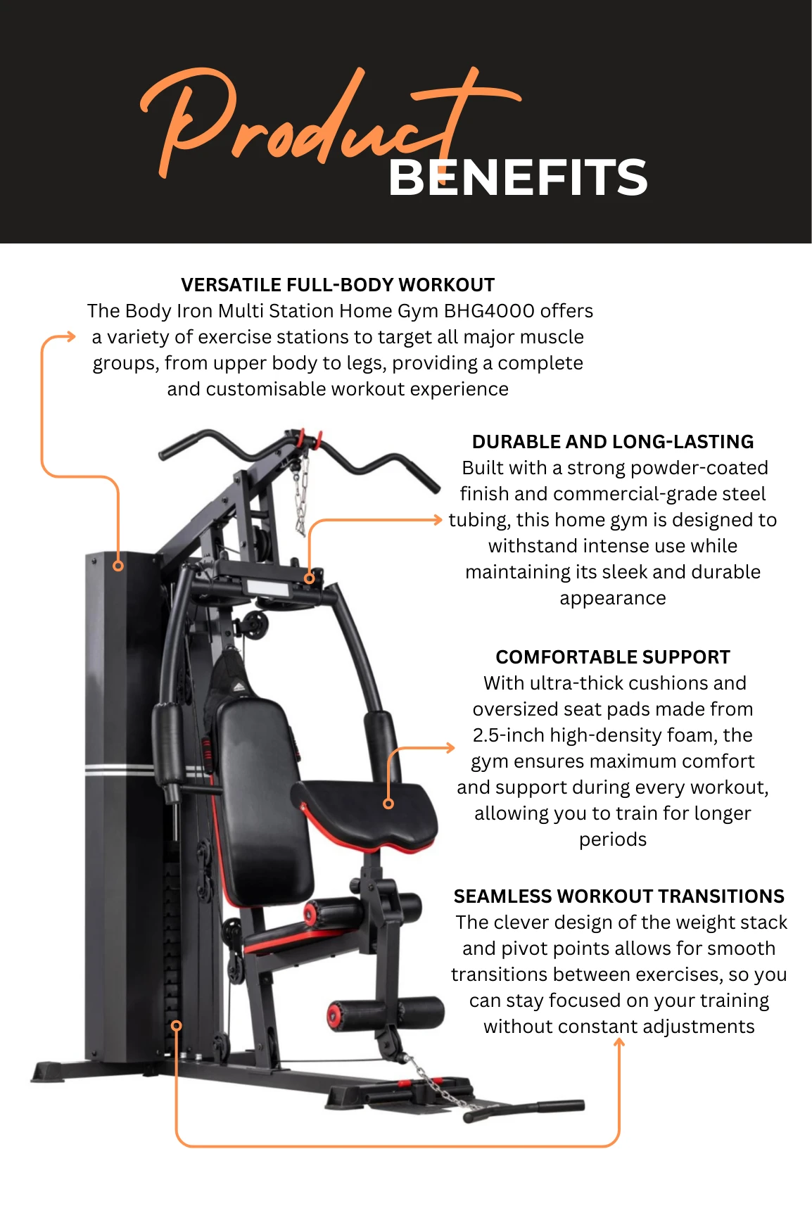 Functional and versatile, the Body Iron Multi Station Home Gym BHG4000 provides numerous exercises at your disposal enabling you to split your training sessions and focus in on specific muscle goals. If it’s an upper body, leg or arm day, there’s a place for it on the Home Gym via high and low chain-linked pulley stations.