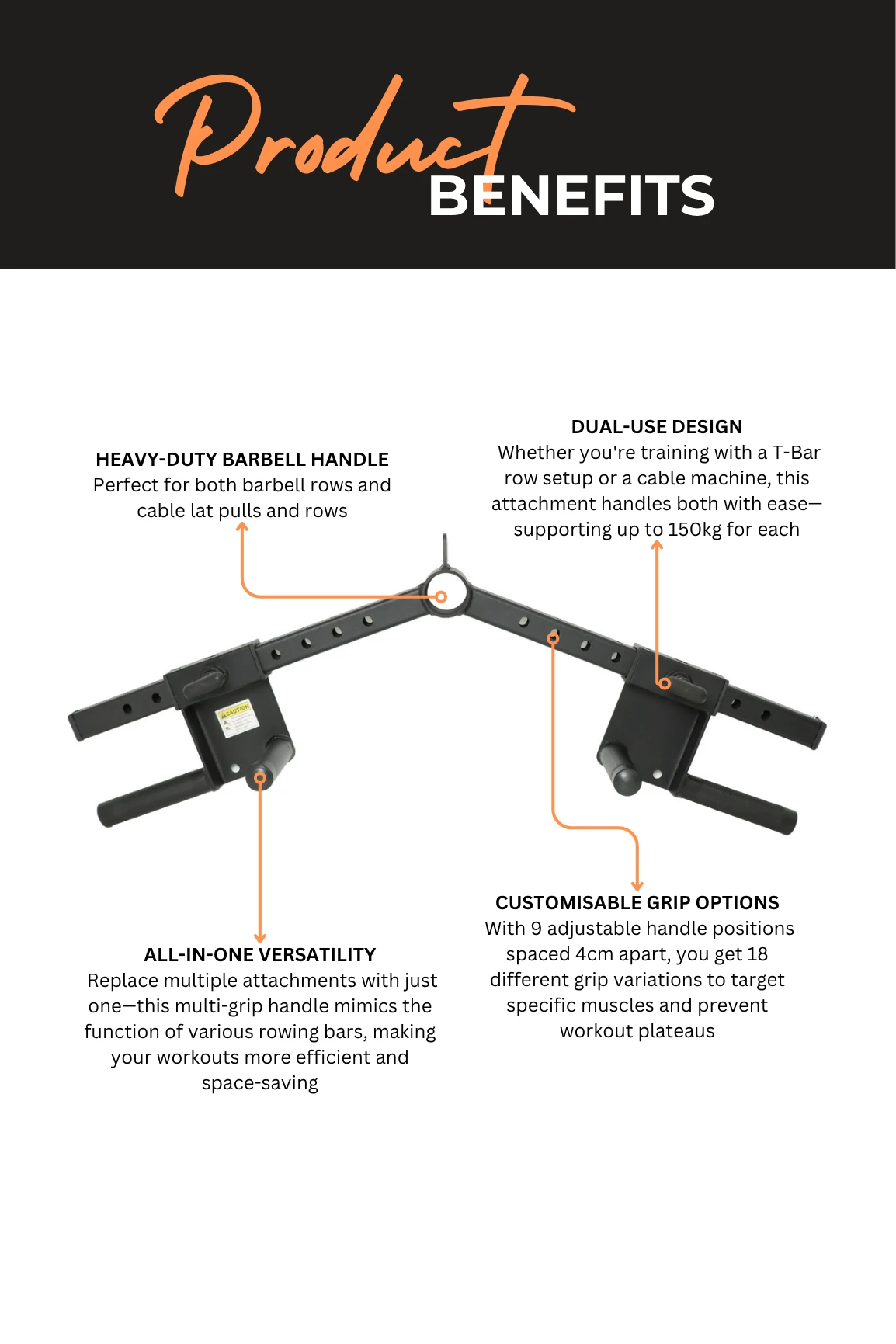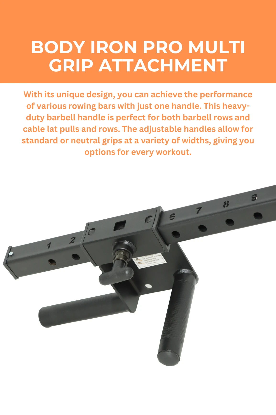 Enhance your workout with the versatile Body Iron Multi Grip Attachment, designed for use on both T-Bar rows and cable machines.