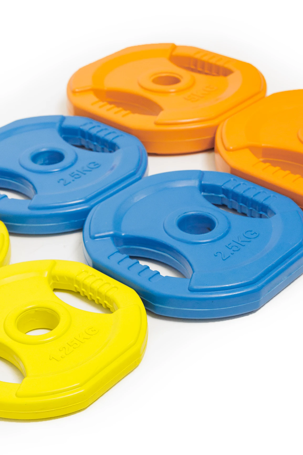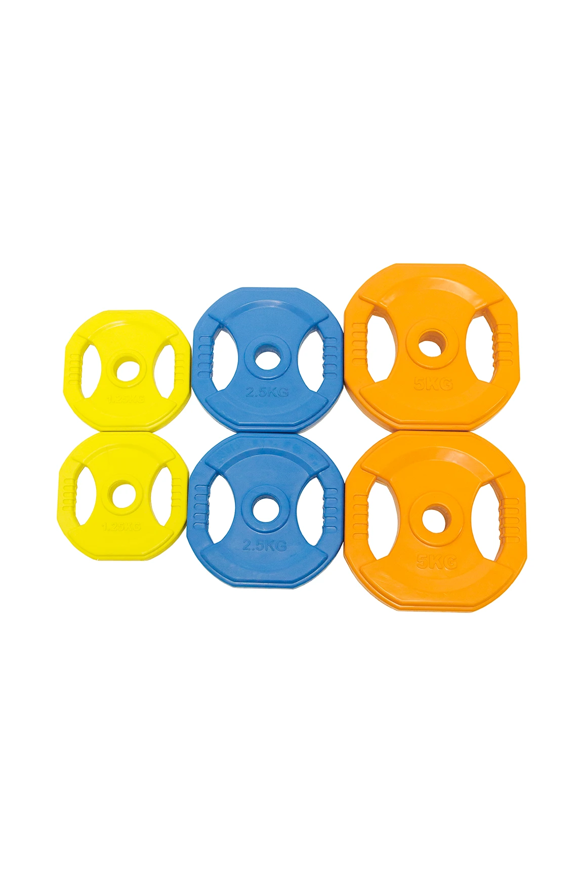 - Plate Sizes: 2x 5kg (Orange), 2x 2.5kg (Blue), 2x 1.25kg (Yellow)