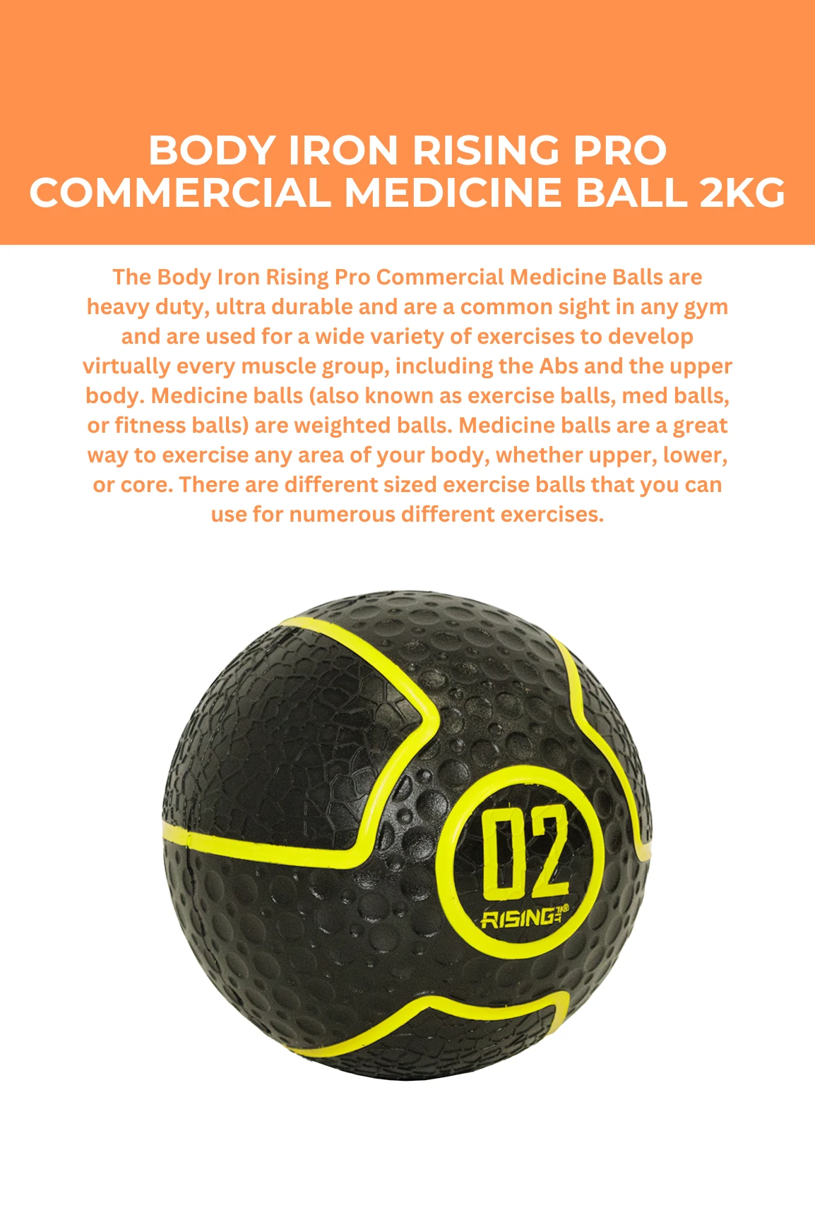 The Body Iron Rising Pro Commercial 2KG Medicine Ball are heavy duty, ultra durable and are a common sight in any gym and are used for a wide variety of exercises to develop virtually every muscle group, including the Abs and the upper body. Medicine balls (also known as exercise balls, med balls, or fitness balls) are weighted balls. Medicine balls are a great way to exercise any area of your body, whether upper, lower, or core. There are different sized exercise balls that you can use for numerous different exercises.