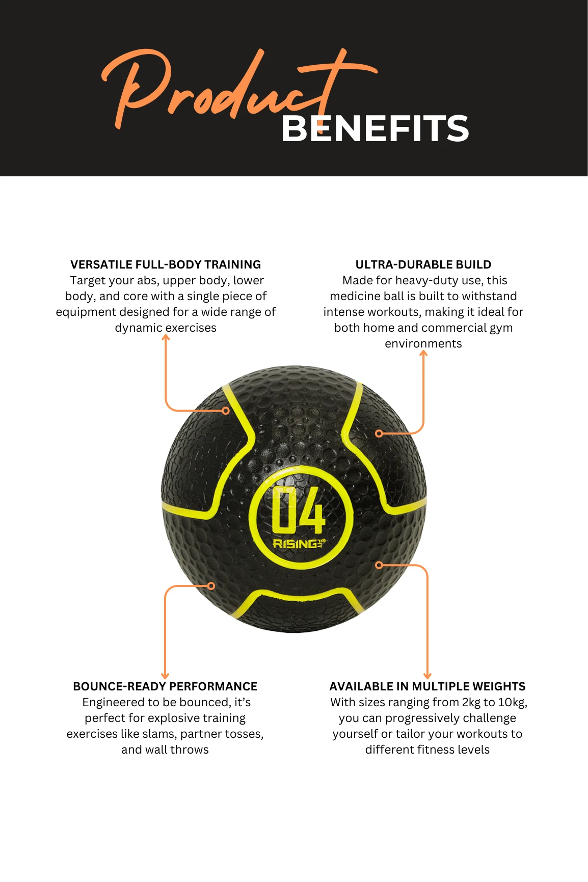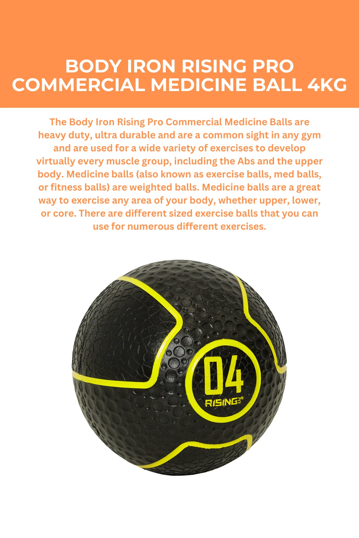 The Body Iron Rising Pro Commercial Medicine Ball 4KG are heavy duty, ultra durable and are a common sight in any gym and are used for a wide variety of exercises to develop virtually every muscle group, including the Abs and the upper body. Medicine balls (also known as exercise balls, med balls, or fitness balls) are weighted balls. Medicine balls are a great way to exercise any area of your body, whether upper, lower, or core. There are different sized exercise balls that you can use for numerous different exercises.