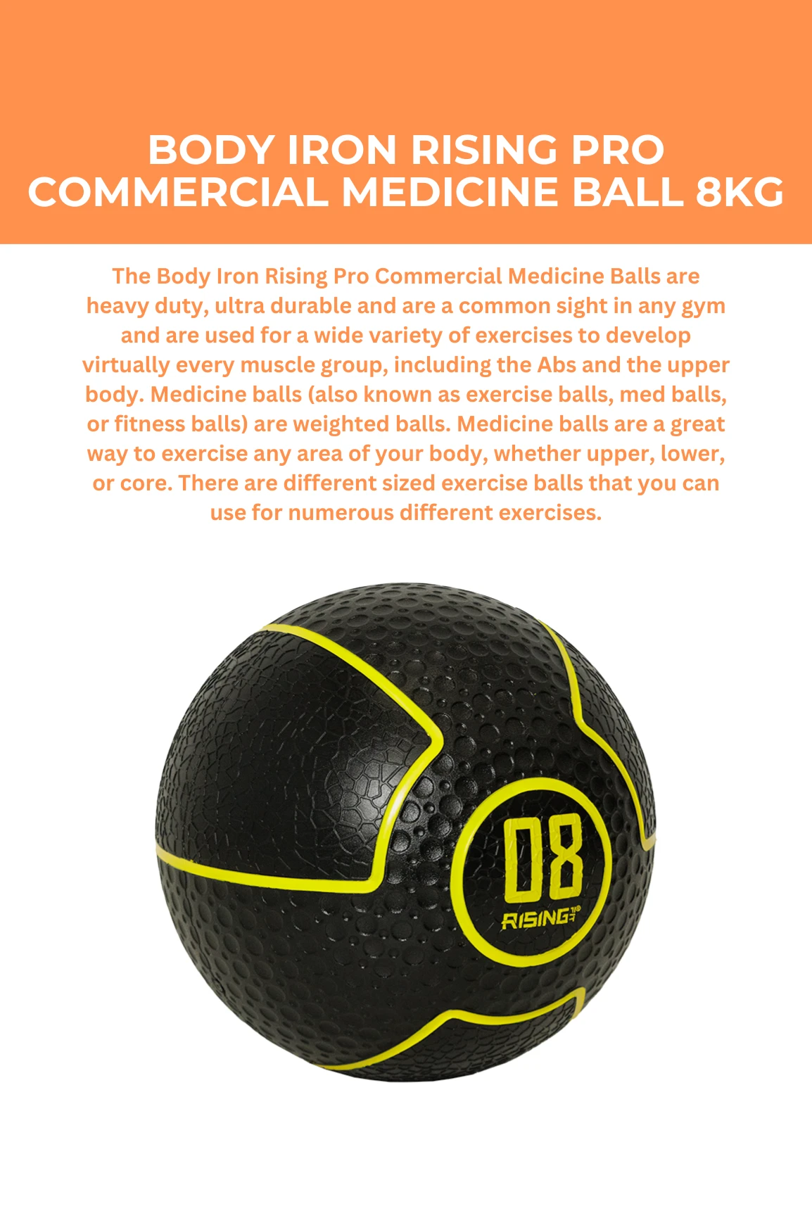 The Body Iron Rising Pro Commercial Medicine Ball 8Kg are heavy duty, ultra durable and are a common sight in any gym and are used for a wide variety of exercises to develop virtually every muscle group, including the Abs and the upper body. Medicine balls (also known as exercise balls, med balls, or fitness balls) are weighted balls. Medicine balls are a great way to exercise any area of your body, whether upper, lower, or core. There are different sized exercise balls that you can use for numerous different exercises.