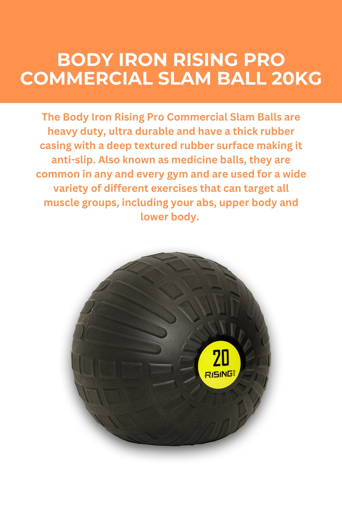 The Body Iron Rising Pro Commercial Slam Balls are heavy duty, ultra durable and have a thick rubber casing with a deep textured rubber surface making it anti-slip. Also known as medicine balls, they are common in any and every gym and are used for a wide variety of different exercises that can target all muscle groups, including your abs, upper body and lower body.