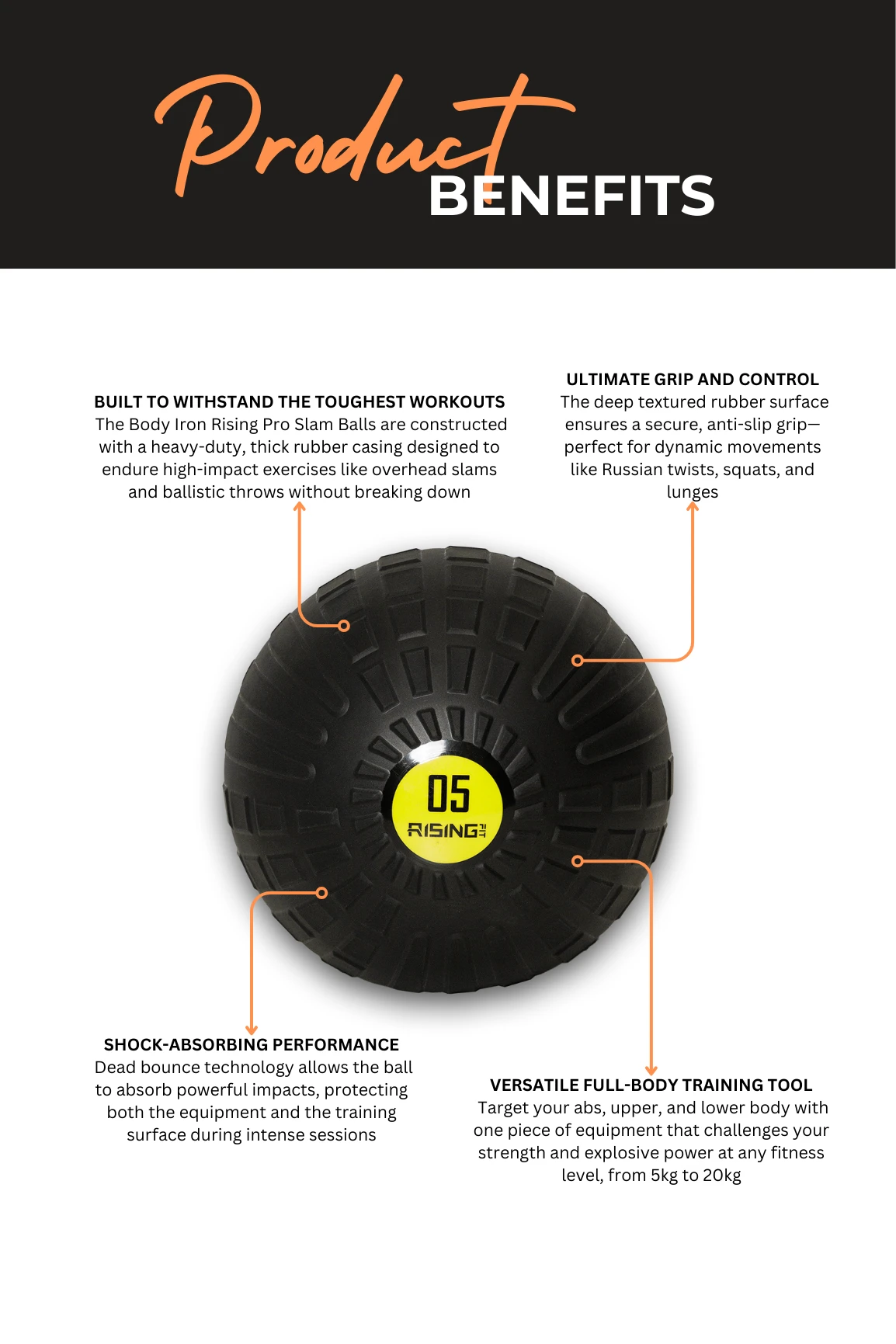 The Body Iron Rising Pro Commercial Slam Balls are heavy duty, ultra durable and have a thick rubber casing with a deep textured rubber surface making it anti-slip. Also known as medicine balls, they are common in any and every gym and are used for a wide variety of different exercises that can target all muscle groups, including your abs, upper body and lower body.