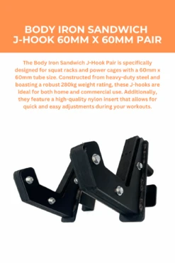 The Body Iron Roller J Hooks are the perfect accessory to help you rack up a heavy squat, deadlift or bench at the end of your workout. The resting position of the bar can be easily adjusted to achieve your perfect placement prior to your lift. These help you avoid rocking every single time you unrack the barbell to assist in your stability.