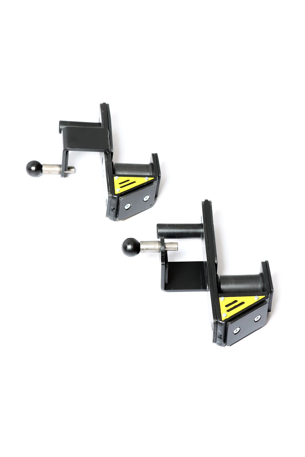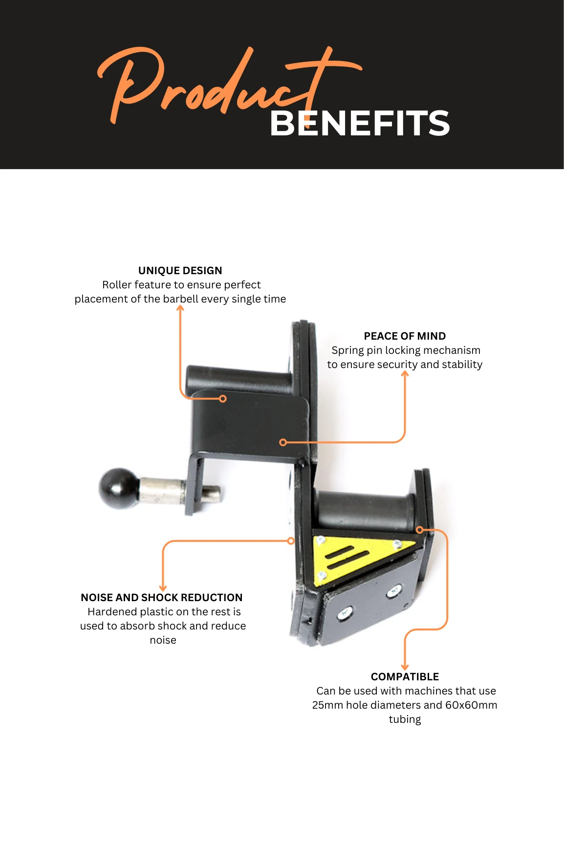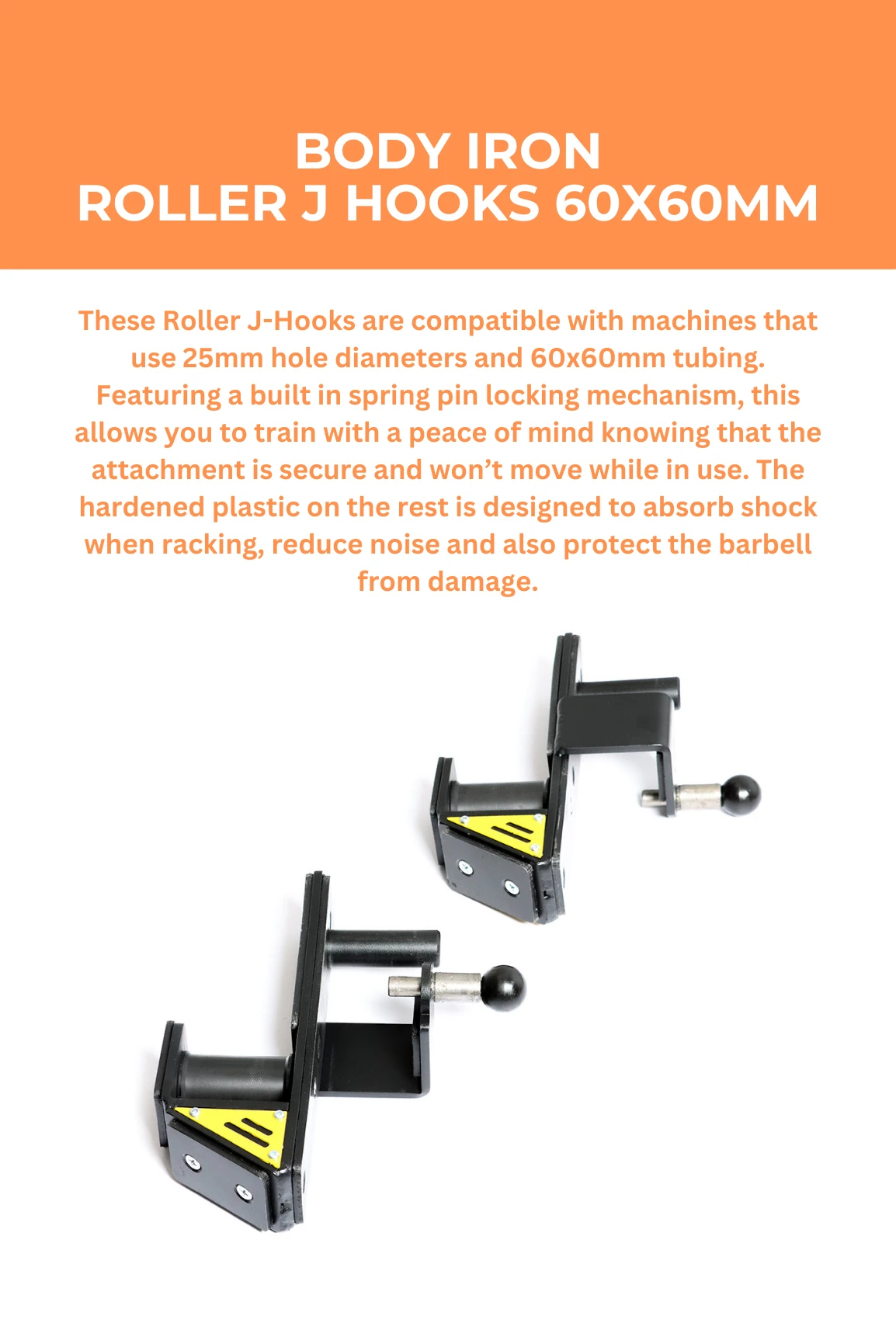 These Roller J-Hooks are compatible with machines that use 25mm hole diameters and 60x60mm tubing. Featuring a built in spring pin locking mechanism, this allows you to train with a peace of mind knowing that the attachment is secure and won’t move while in use. The hardened plastic on the rest is designed to absorb shock when racking, reduce noise and also protect the barbell from damage.