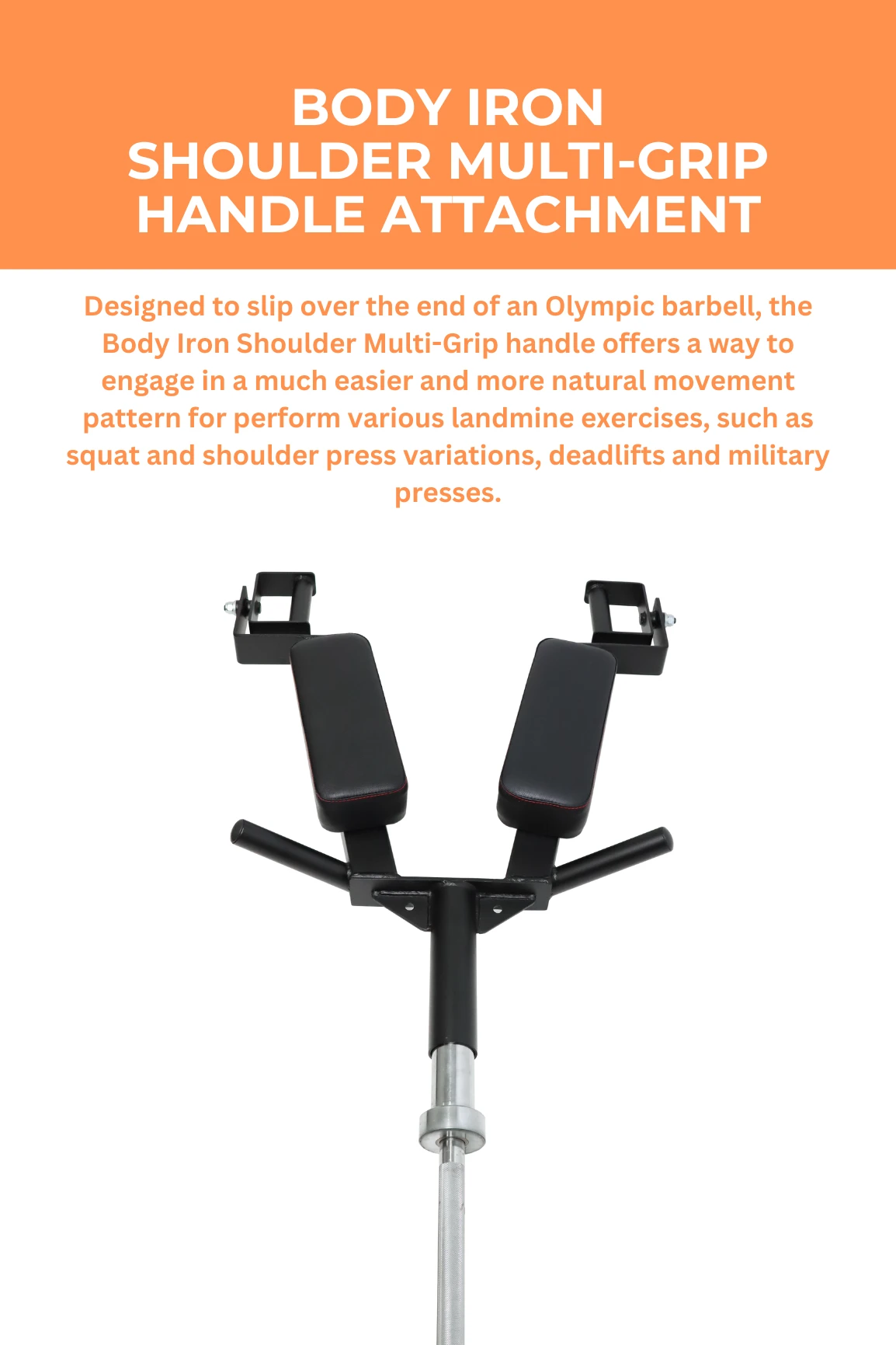 Designed to slip over the end of an Olympic barbell, the Body Iron Shoulder Multi-Grip handle offers a way to engage in a much easier and more natural movement pattern for perform various landmine exercises, such as squat and shoulder press variations, deadlifts and military presses.