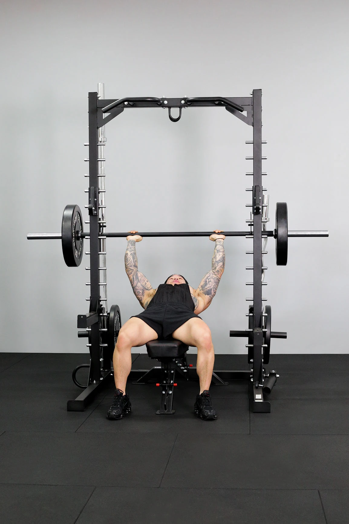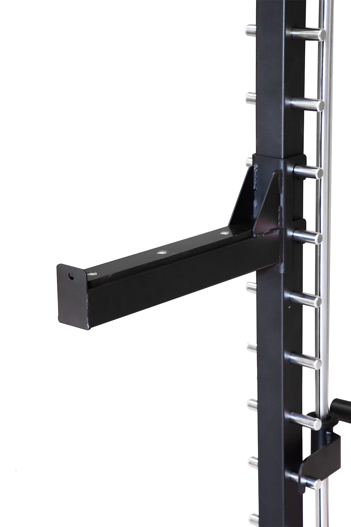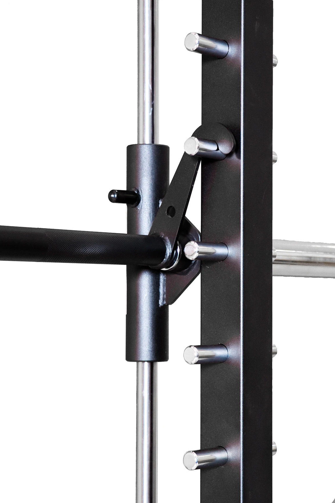 Not only does it come with the spotter arms and J-hooks, the Pro Half Rack Smith Machine also includes 4 weight plate storage pegs and 2 Olympic barbell holders for your convenience.
