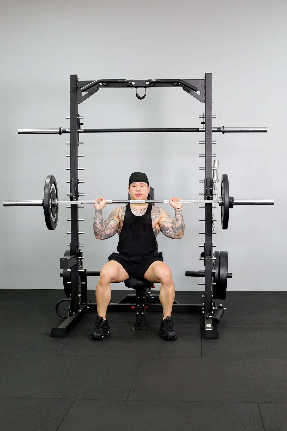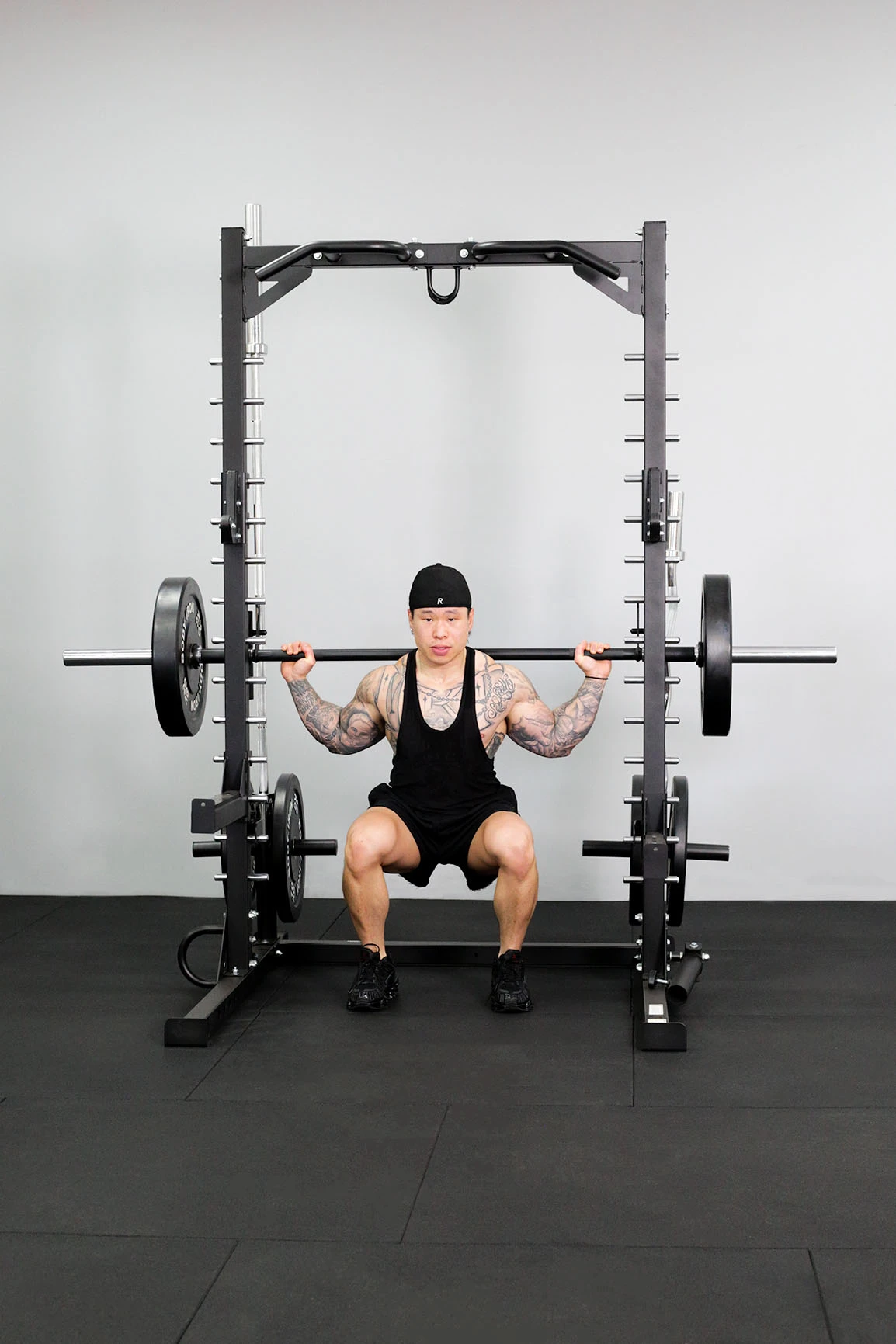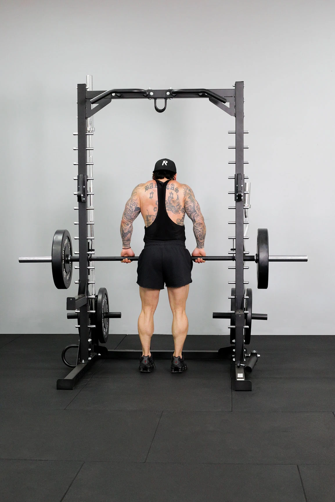 Not only does it come with the spotter arms and J-hooks, the Pro Half Rack Smith Machine also includes 4 weight plate storage pegs and 2 Olympic barbell holders for your convenience.