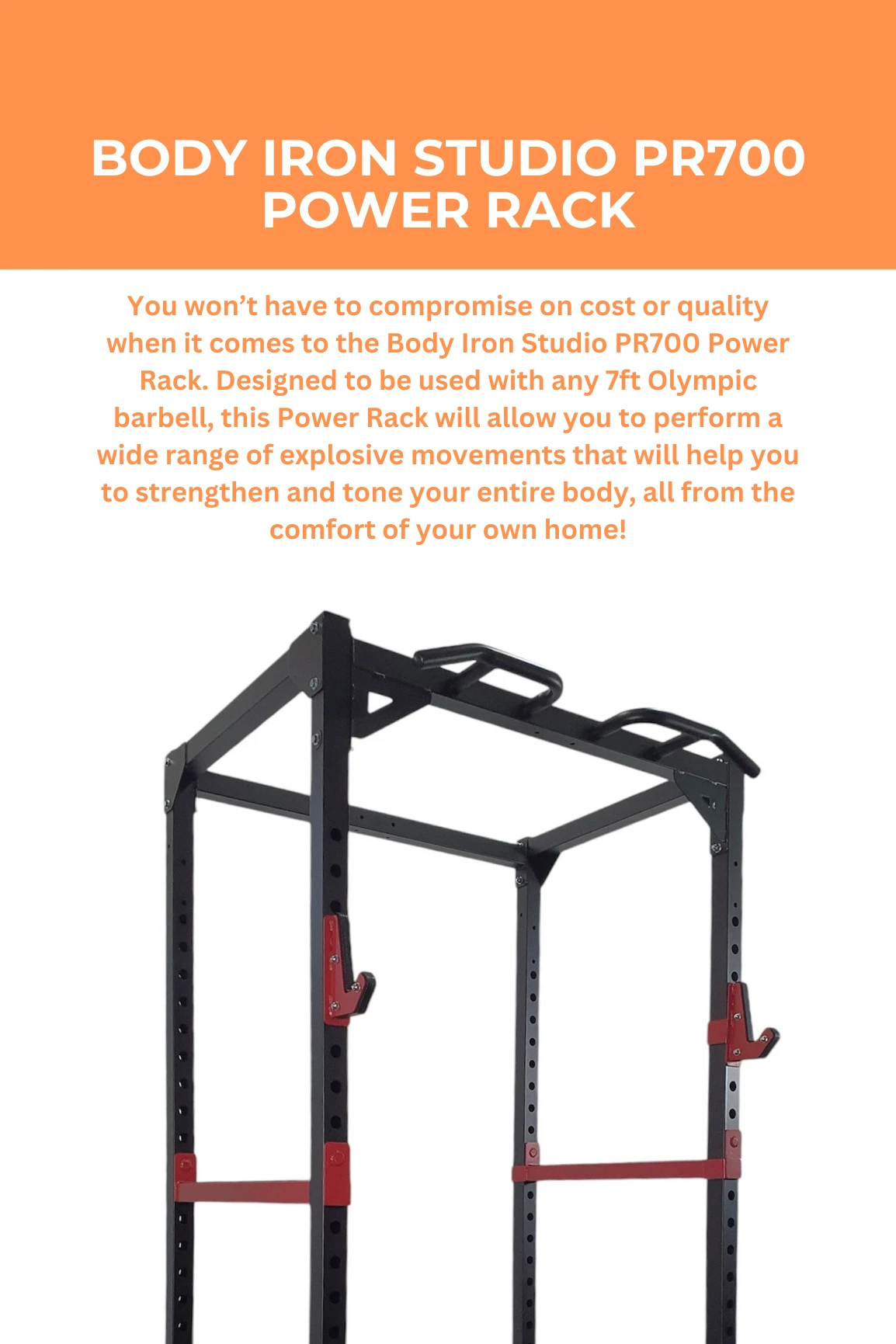 You won’t have to compromise on cost or quality when it comes to the Body Iron Studio PR700 Power Rack. Designed to be used with any 7ft Olympic barbell, this Power Rack will allow you to perform a wide range of explosive movements that will help you to strengthen and tone your entire body, all from the comfort of your own home!