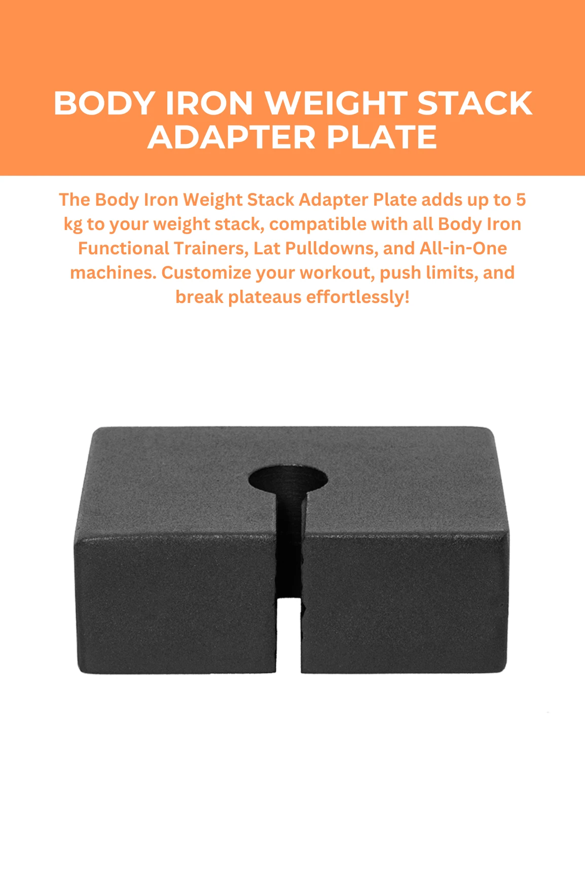 The Body Iron Weight Stack Adapter Plate adds up to an extra 5 kg to your weight stack machine! Compatible with all Body Iron Functional Trainers, Lat Pulldown machines, and All-in-One machines with weight stacks. This adapter plate allows you to increase the weight on existing stacks, helping you lift heavier and reach new fitness goals. It’s an ideal way to customize your workout and break through plateaus. Just insert the Weight Stack Adapter Plate, and get ready to push your limits!