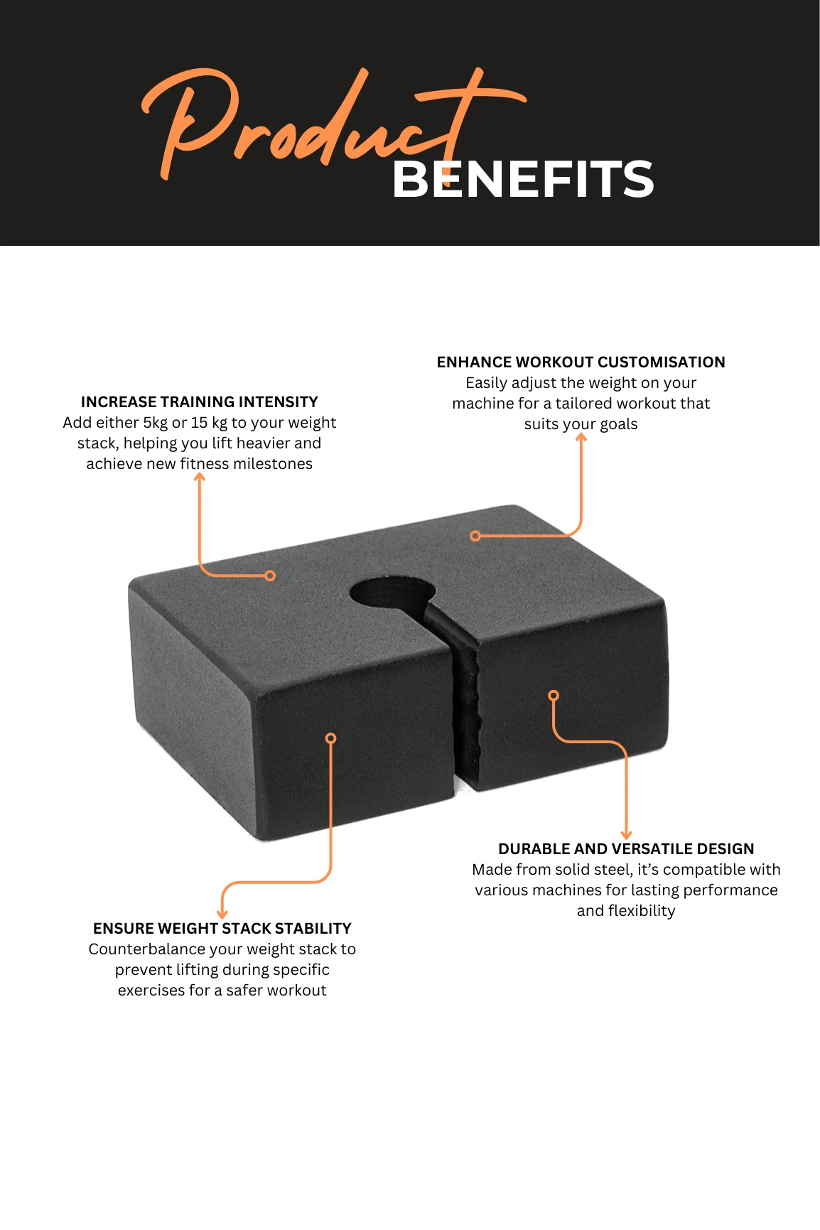 The Weight Stack Adapter Plate is designed to let you stack plates, giving you the option to add either 5 kg or 15 kg to your weight stack.