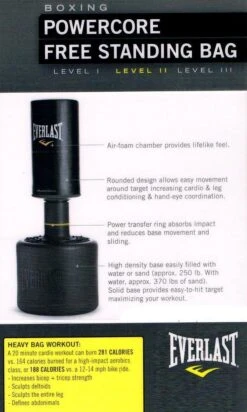 Professional free-standing punching bag EVERLAST 195cm. Bag made of high-density foam, which degrades the strength of great impact. Moving steel core EverFlex technology allows variation in the bag sideways jerks the strongest impact, blows, and makes the bag always comes back to vertical. A protective collar with foam designed to dampen vibrations at the sides of the bag. The flange can be used or removed. The base is made from thick PVC, which can be filled with either water or sand, making the base weight exceeds 110kg
