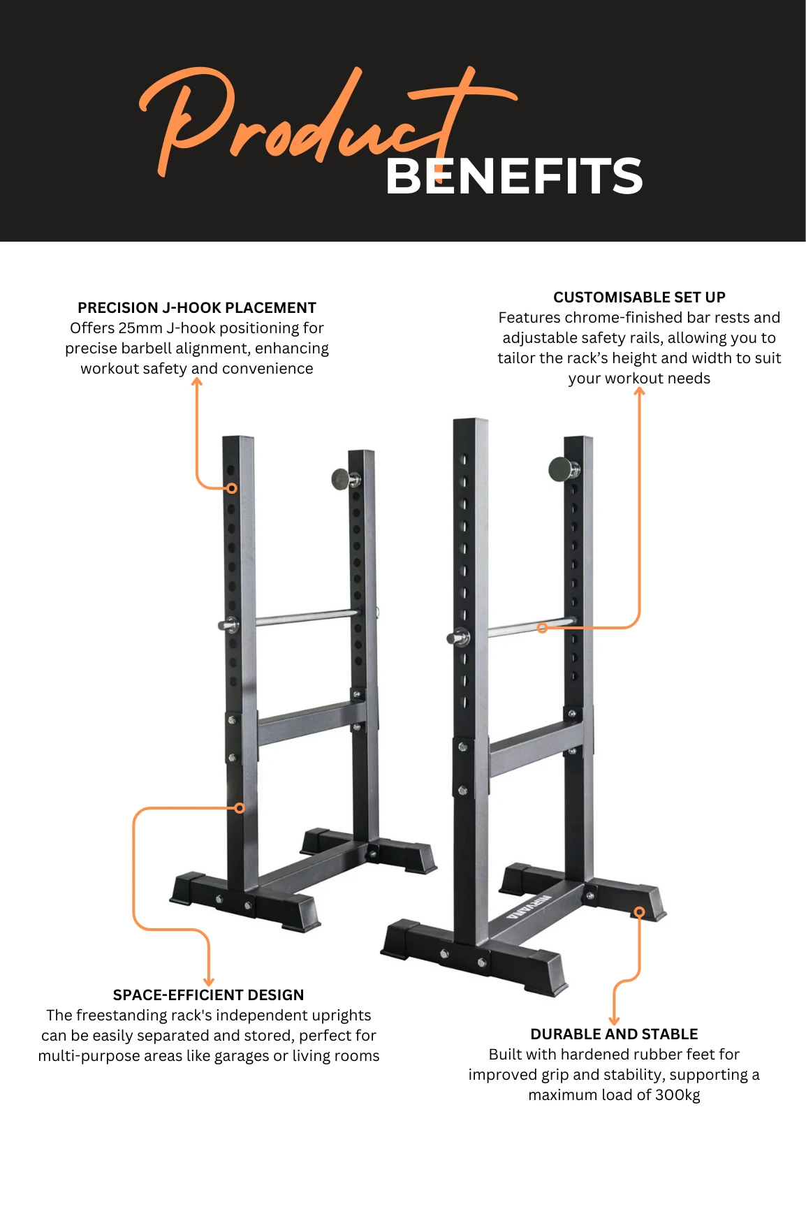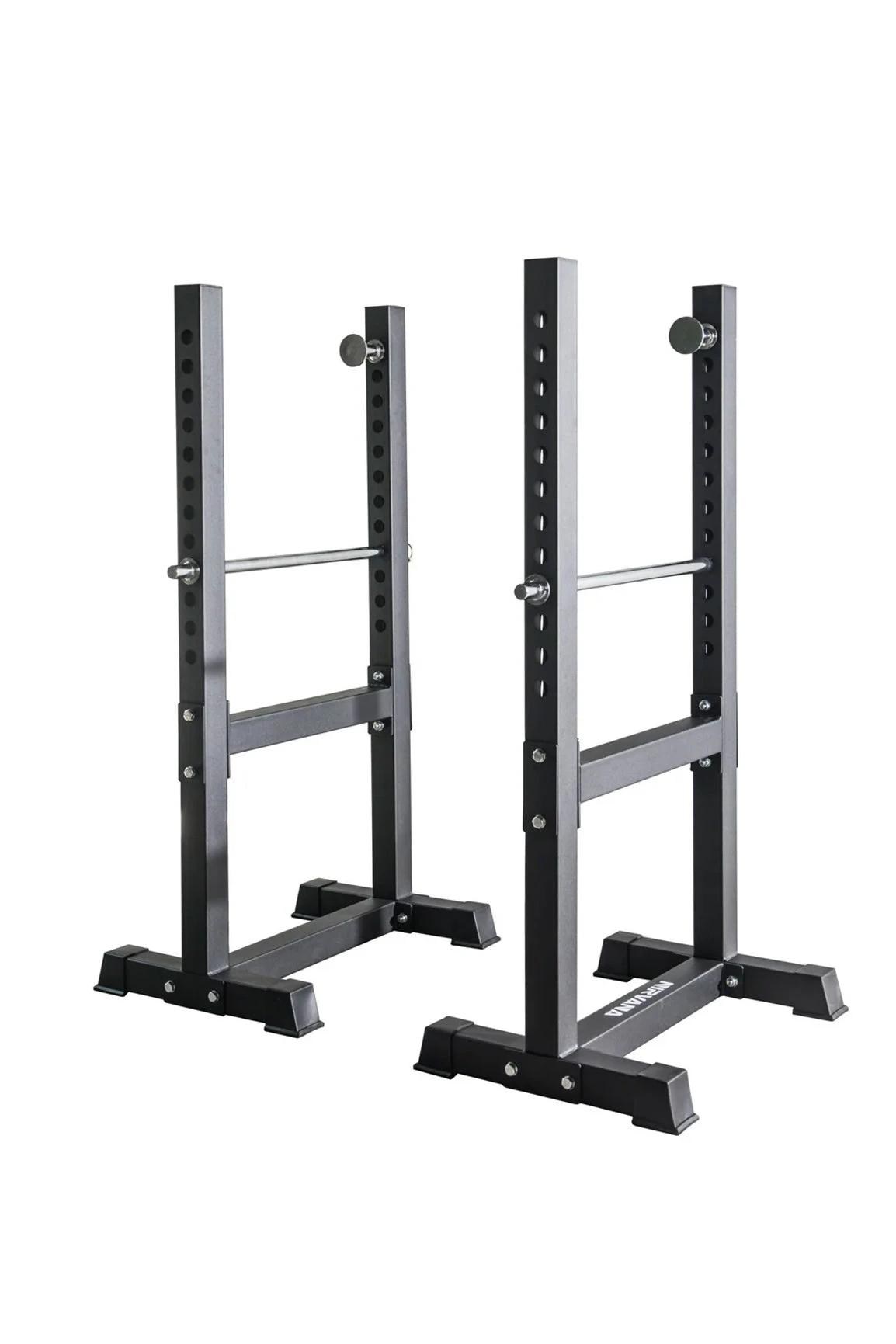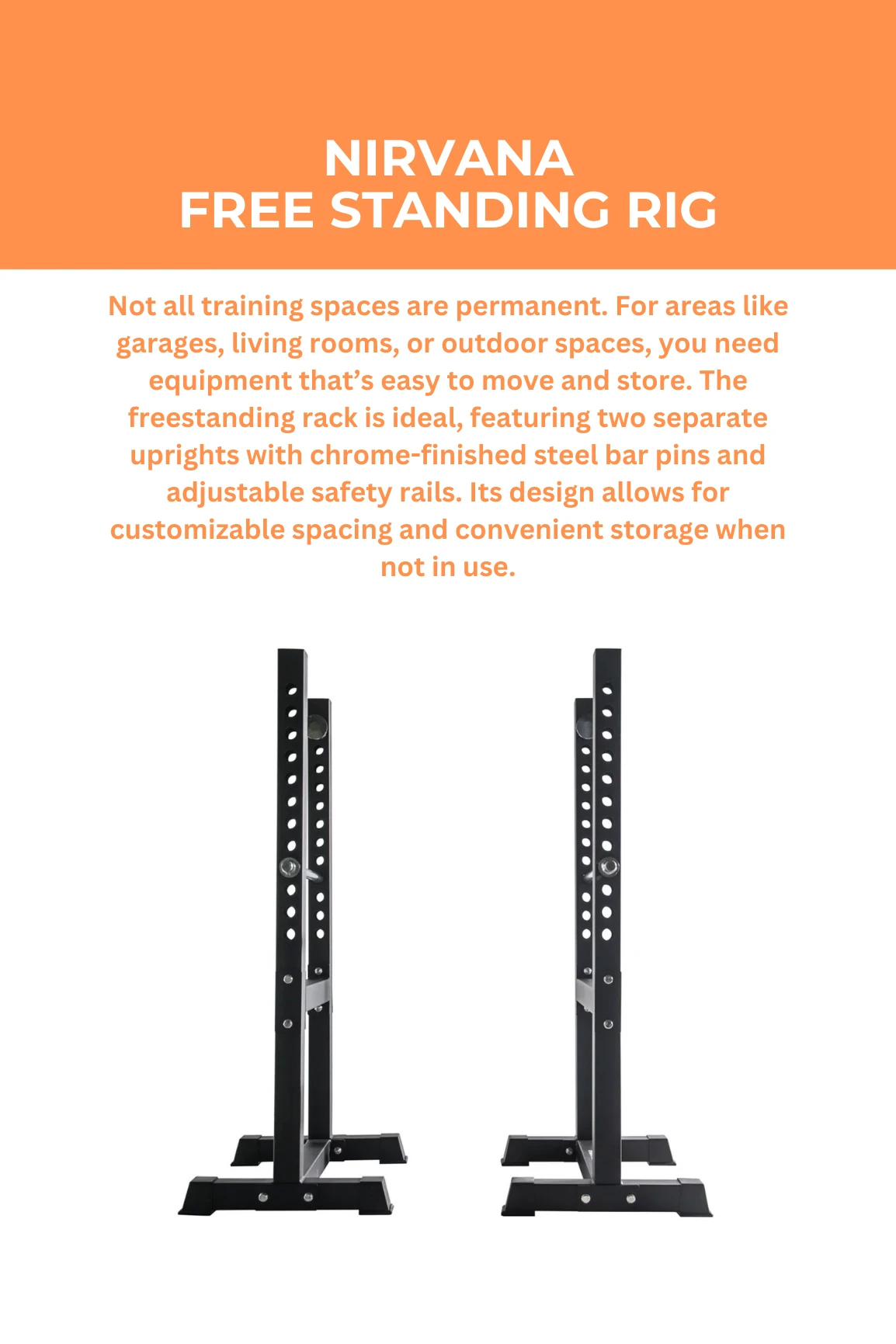 Not all training spaces are always training spaces. When you have an area that doubles as a garage, lounge room or even an outdoor entertaining area, you need equipment that can be stored away off to the side and not consume all the space. The same goes if you need equipment that can be easily moved around and to different spacing. This is where the freestanding rack is perfect. The free standing rack is two individual sides of both a forward and rear upright with chrome finish steel bar pins and matching safety rails. This rack also comes with a chrome finish safety rail that is easily adjustable to the height of your choosing. Two freestanding uprights make this rig adjustable to suit the spacing required for your chosen exercise as well as the easy of being able to separate and tuck away for easy storage.