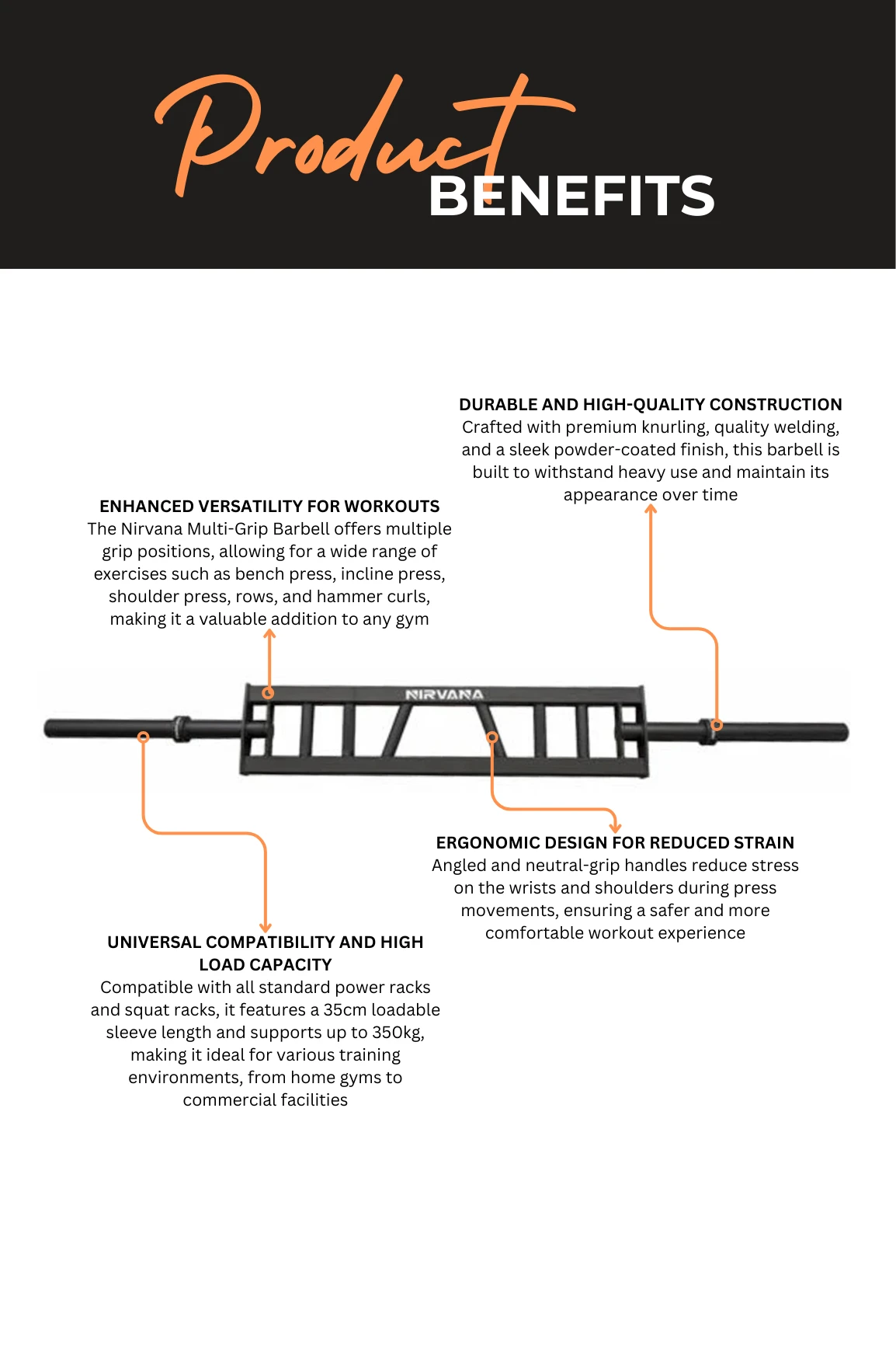 The Nirvana Multi-Grip Bar is the perfect accessory bar to incorporate in any workout space including your home gym, studio gym or commercial gym with quality welding and sleek powder coating which looks great and can hold up for a long time.