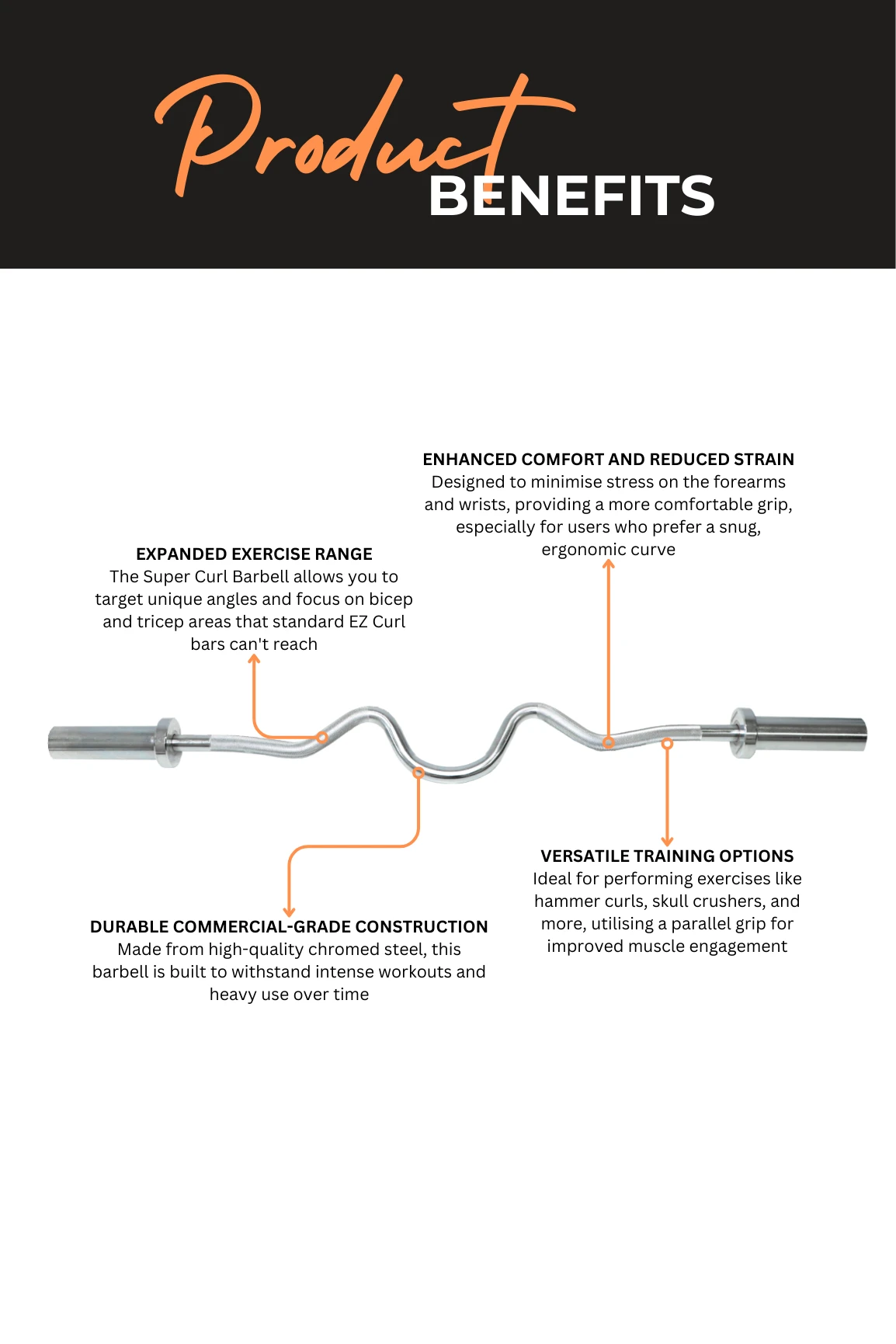 The Super Curl Barbell enables you to expand your range of exercises. Made from commercial quality chromed steel, this barbell is built to take a pounding, workout after workout. Push your workout and get those angles the EZ Curl bar cannot get. Designed to reduce stress on the forearm and wrist whilst providing a comfortable grip. Many find the super curl bar more comfortable than the EZ Curl. It really comes down to personal preference and which exercises work for you.